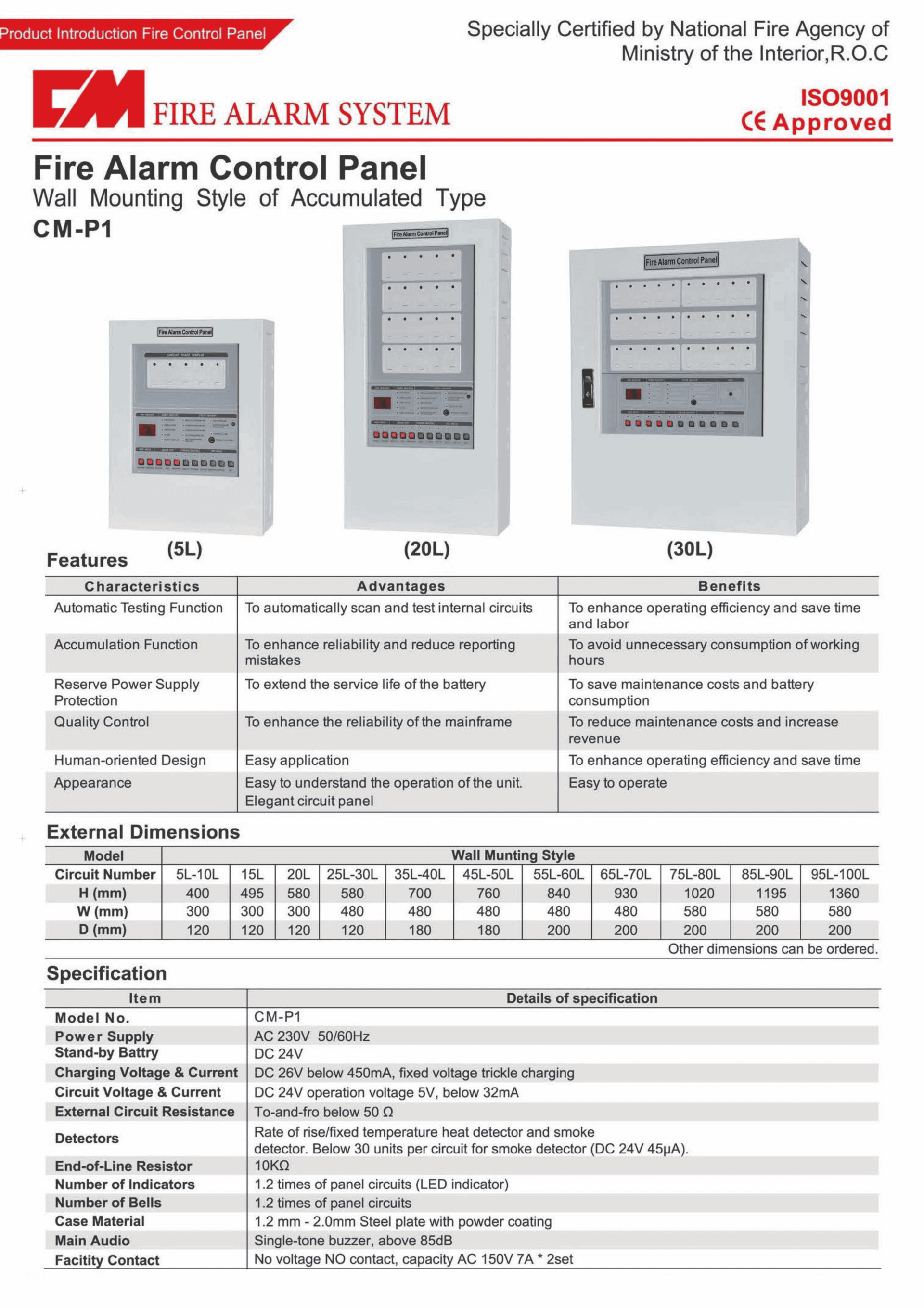 ตู้ FCP CM-P1 คือตู้ควบคุมระบบสัญญาณแจ้งเหตุเพลิงไหม้แบบ Conventional ที่ครอบคลุมที่สุดในซีรีส์ CM รองรับ 5 / 10 / 15 / 20 / 30 / 40 / 50 Zone ใช้ไฟ 230V AC พร้อม Stand-by Battery 24V DC Trickle Charge ผ่านมาตรฐาน ISO9001 และ CE จาก Chung Mei ไต้หวัน เหมาะสำหรับโครงการทุกขนาดตั้งแต่อาคารสำนักงานไปจนถึงอาคารสูง