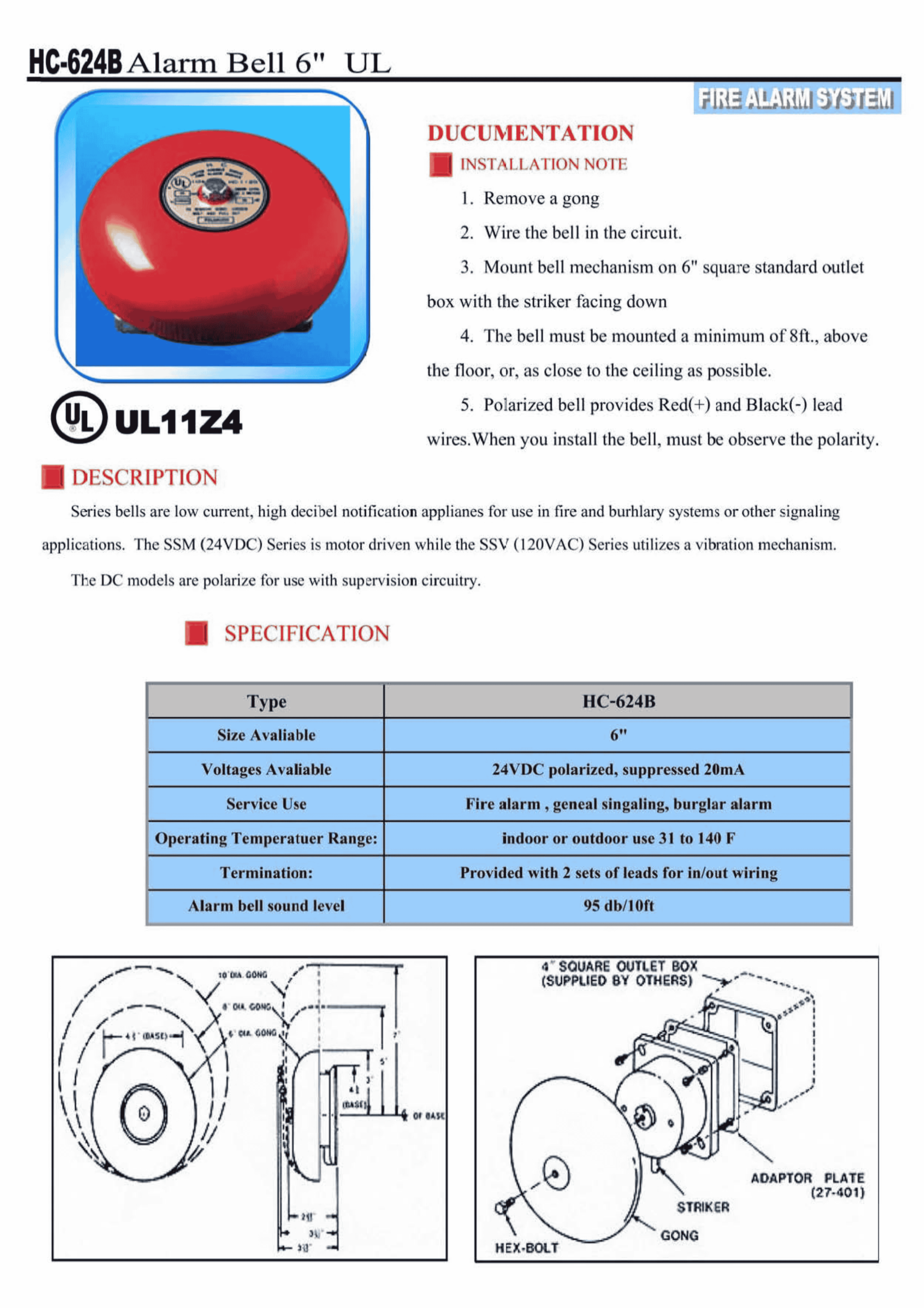 กริ่งเตือนไฟไหม้ HC-624BAlarm Bell 6 Inch | UL Listed | 95 dB | 24V DC