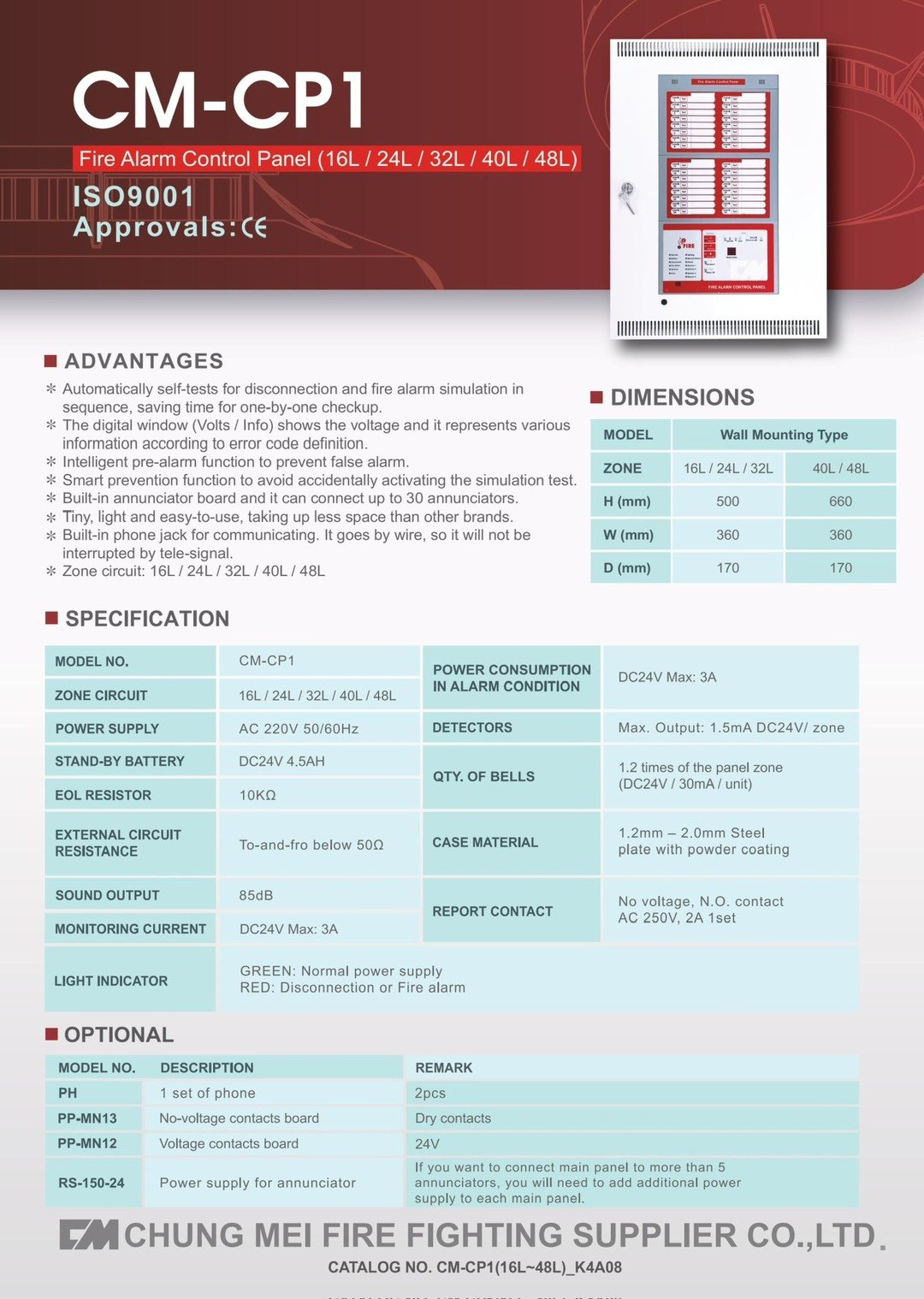 ตู้ FCP CM-CP1 รุ่น 16-48 Zone คือตู้ควบคุมระบบสัญญาณแจ้งเหตุเพลิงไหม้แบบ Conventional สำหรับอาคารขนาดกลางถึงใหญ่ รองรับ 16, 24, 32, 40 และ 48 Zone พร้อม Stand-by Battery DC24V 4.5AH และ Annunciator Board ในตัวรองรับสูงสุด 30 ชุด ผ่านมาตรฐาน ISO9001 และ CE จาก Chung Mei ไต้หวัน